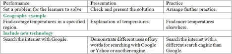 I have developed the model with its many variations in some detail for my courses. Things get quite complex when you try to cover lots of different teaching and learning needs under the three slots. And linking what the learners do, or want to do, or fail to do, etc., with what the teacher does is particularly important. Nevertheless, I find that my three areas of new development plus the 3P scaffolding make things rational rather than being a let’s-just-try-this approach. Perhaps equally important, it serves as a template to observe reports of teaching methods and therefore a very useful tool for evaluation. I have never yet found a teaching/learning event that could not be understood and analysed quickly this way.