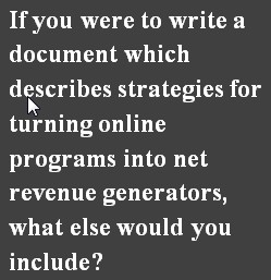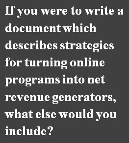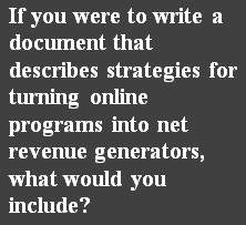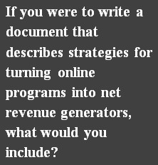 Although no doubt there are some “secrets” for generating net revenue from online learning which are being held proprietarily, I believe that there are many people who would be interested in a more public description of this information. So, care to share your ideas? If you were to write a document that describes strategies for turning online programs into net revenue generators, what else would you include?