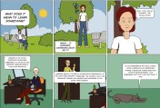 As a graphic medium of storytelling, comics combine pictorial elements with more or less scarcely used text modules – often in the form of speech bubbles. This results in a dialogic style of narration. One way to use this form of narration in instructional design is to depict controversial topics by engaging two characters in a dispute. Another possibility is to trace historic developments and events as pictorial sequences. Following ideas of anchored instruction, comics can picture a scenario or problem that forms the starting point for investigating the learning content. Finally, comics can also be used to simply loosen the ground, i.e., by including a sketch, learning material can be rendered less dense.
