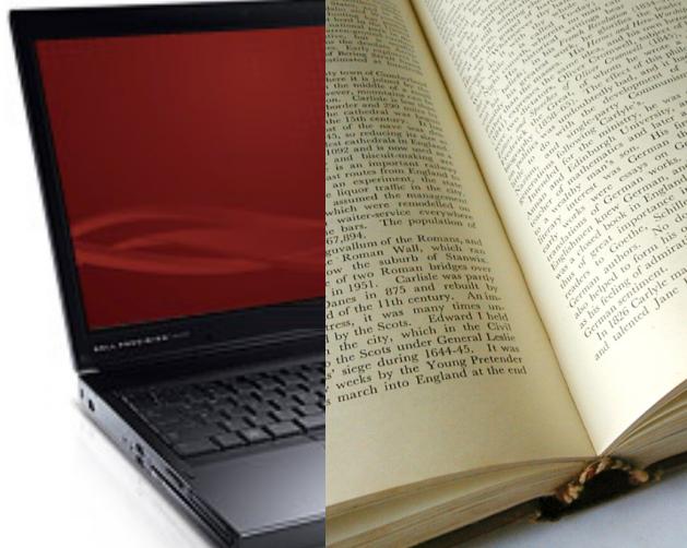 composed image, with an old laptop with floppy slot on the left and history book on the right