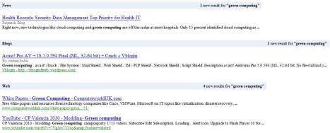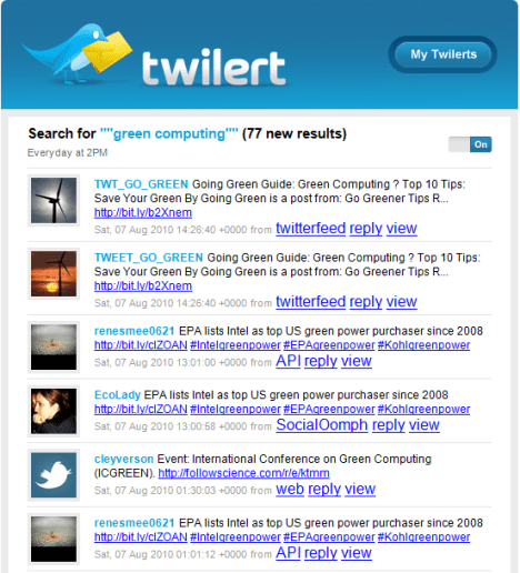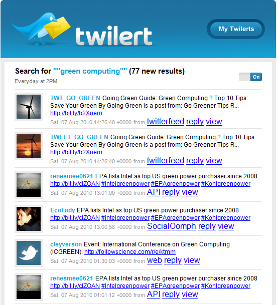 Green computing is generally thought of as the “study and practice of efficient and eco-friendly computing resources.” Helping the environment by decreasing energy use and at the same time reducing associated costs seems a no-brainer. Want to learn about green computing and what you can do on a personal level to promote it? Would you like customized information about green computing delivered free to your desktop? Two delivery vehicles for the Internet information highway are Google Alerts and Twilert Twitter tweets (say that fast three times). Use them to get daily e-mail messages with gleanings from the Internet.