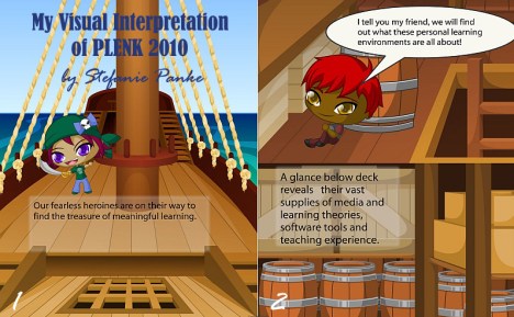 Indeed, a side effect of the course is that I continuously encounter new tools in diagram making and visualization. One proved to be a very nice add-on to my earlier article, “E-Comics as Teaching Tools.” Critics have lavished awards on the Web site kerproof. The handling is fairly simple, and yet it is possible to produce a moderately complex storyline – for example “My Visual Interpretation of PLENK 2010.”