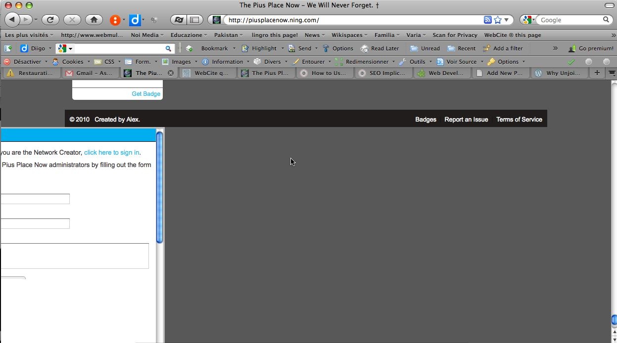 To illustrate how the Ning lock works, let’s use http://piusplacenow.ning.com, which is the network created by Alex, about whose nondeletion he wondered academically — he successfully migrated it to http://piusplacenow.spruz.com —  in the above mentioned discussion. In fact, it is now greyed, with most of the content covered overlaid by a Ning form: