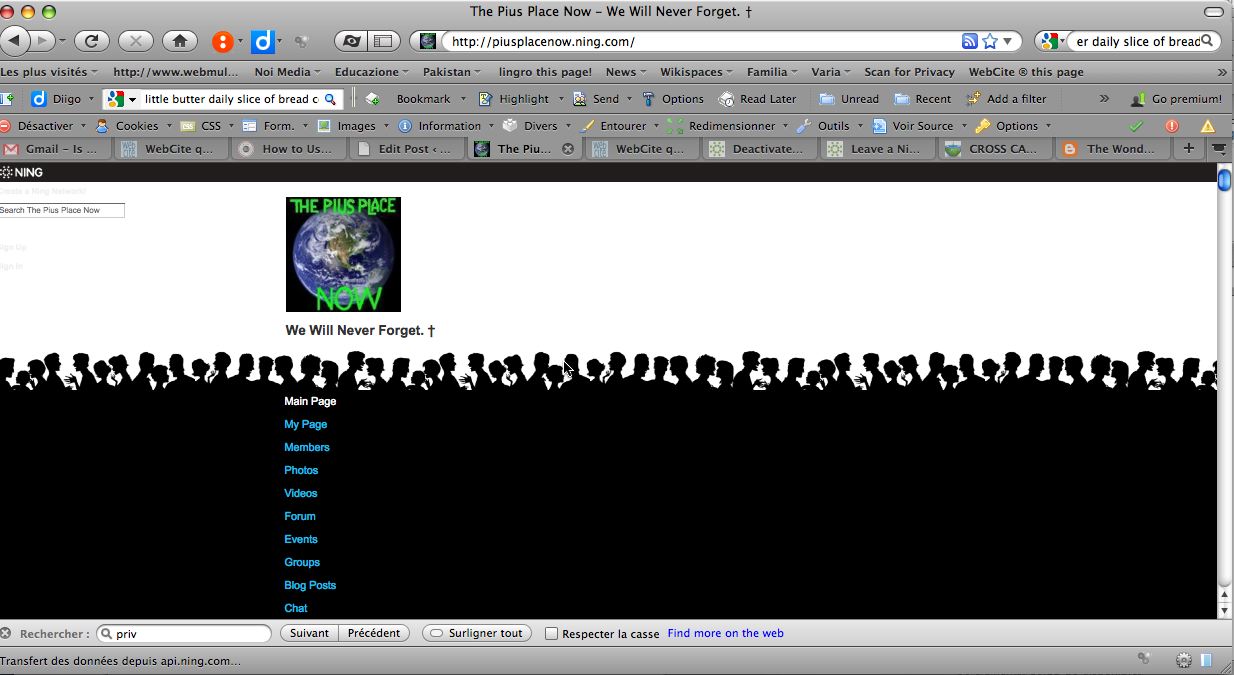 Actually, the best way to read “locked” Ning networks seems to be via the Opera browser, which gives the links to all the features. Here is a screenshot of the In a locked network group I created in the allegedly locked http://piusplacenow.ning.com network, as seen with Opera:
