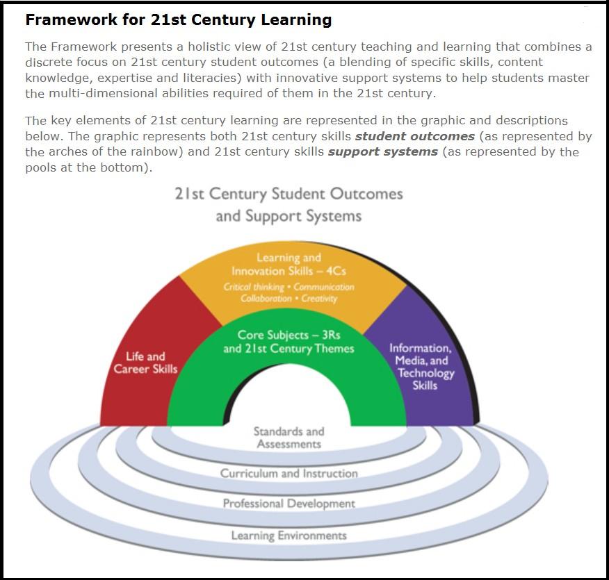 The Framework presents a holistic view of 21st century teaching and learning that combines a discrete focus on 21st century student outcomes (a blending of specific skills, content knowledge, expertise and literacies) with innovative support systems to help students master the multi-dimensional abilities required of them in the 21st century. [bold emphasis added]