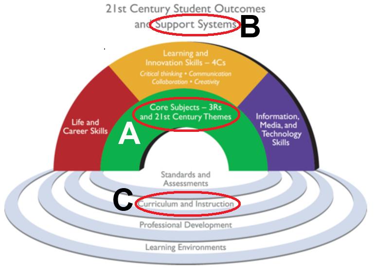 As a case in point, I submit the following “Framework for 21st Century Learning” from the Partnership for 21st Century Skills site. The letters A, B, and C as well as red circles have been added to facilitate my comments.