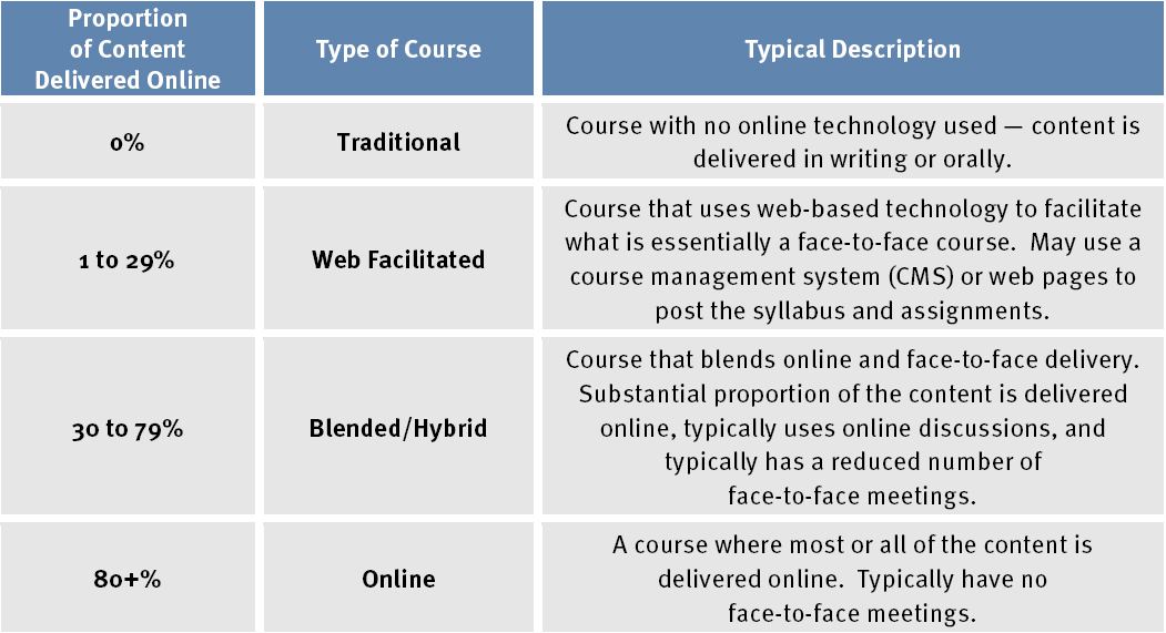 Online courses, the primary focus of this report, are defined as those in which at least 80 percent of the course content is delivered online. Face-to-face instruction includes courses in which zero to 29 percent of the content is delivered online; this category includes both traditional and web facilitated courses. The remaining alternative, blended (sometimes called hybrid) instruction is defined as having between 30 percent and 80 percent of the course content delivered online. While the survey asked respondents for information on all types of courses, the current report is devoted to online learning only. (5)
