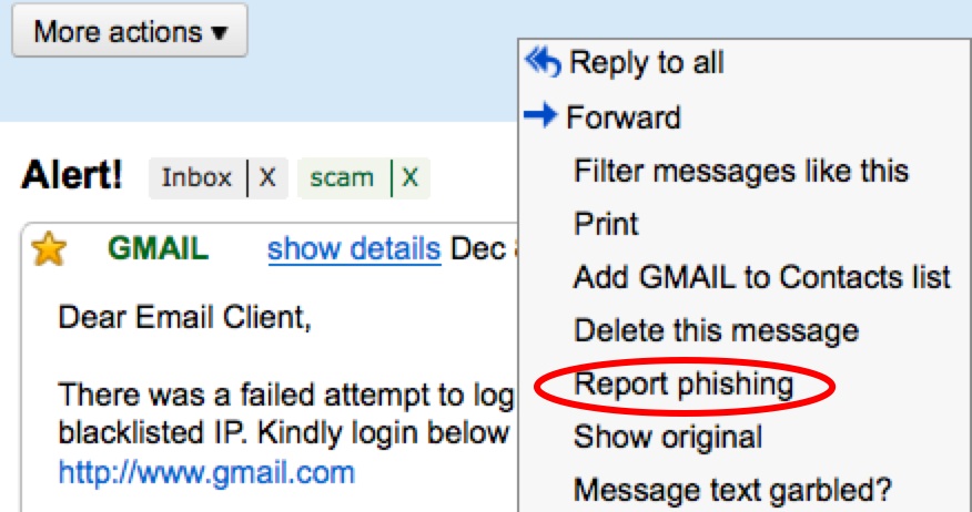 I’m not saying that my reporting that attempt caused the block and deletion: others probably reported the problem before me, and Google (of which gmail is an app) and Firefox have their own tools (see Google & Firefox 2 Anti-Phishing Warning In Action by Danny Sullivan. Search Engine Land. Jan. 20, 2007). However, reporting phishing attempts is a civic duty, as these tools rely on users’ reports.