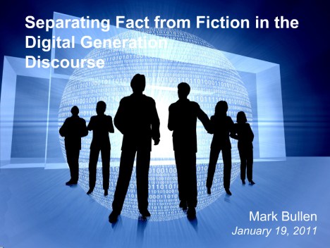 In January this year I participated in a webinar offered by IT Sligo (Ireland) titled, Separating Fact from Fiction in the Digital Generation. The webinar leader was Mark Bullen from the British Columbia Institute of Technology (which meant the webinar was at a reasonable hour for the west coast of the U.S.). It was an eye opener for me because I had been sucked in by the popular books, Teaching Digital Natives: Partnering for Real Learning (2010), by Marc Prensky and Grown Up Digital: How the Net Generation Is Changing Your World (2008) by Don Tapscott.