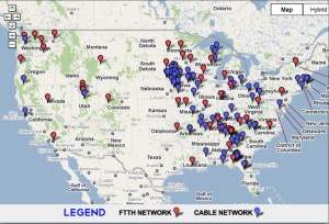 About the Google Map with the red and blue markers you also give a screenshot of, the Community Broadband Network Map original page with the interactive version of the map explains that: