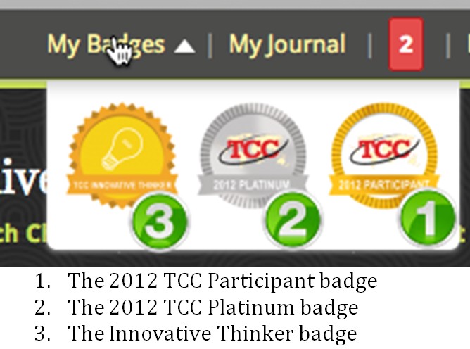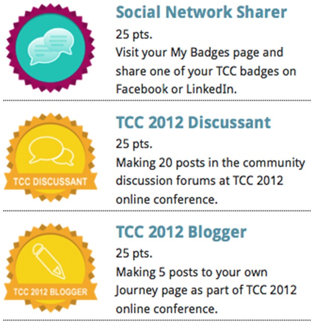Thanks to the generosity of Bert Kimura of the University of Hawaii at Manoa, I was able to sit in on the 2012 Technology, Colleges and Community Worldwide Online Conference (TCC). This was not my first online conference, but it was the first I’ve encountered that incorporated a badging system so intrinsically into its programming.