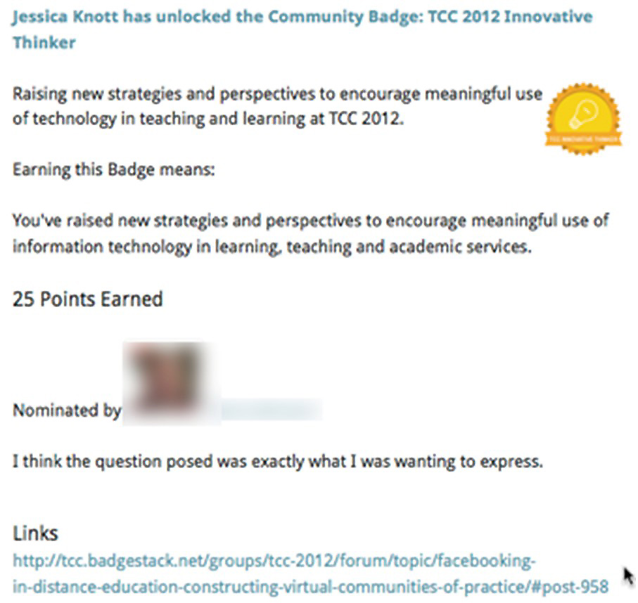 Finally, the aspect of badging I thought TCC handled extraordinarily well was the ability to nominate other attendees, based upon our interactions with them. I was honored to be nominated for, and to receive, the Innovative Thinker badge for something I posted in a chat room during a presentation surrounding the use of Facebook in the college classroom. This didn’t take away from my focus on the presentation, but it was a really neat way to find out that someone agreed with a point I’d made. It inspired me to reward others as well. From a social learning standpoint, this nomination process worked wonderfully.