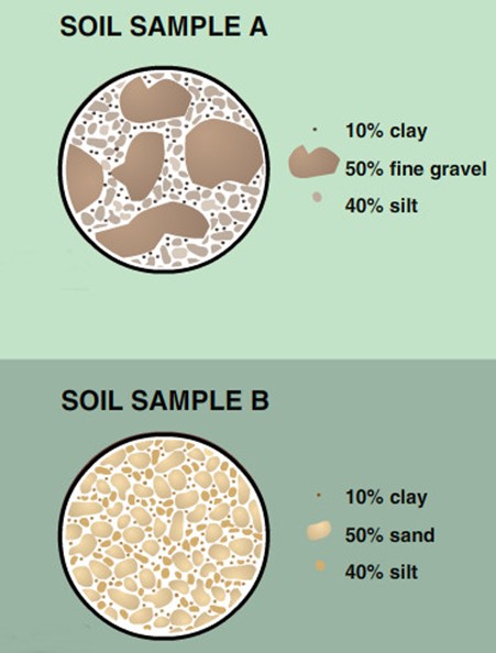 Students analyze two samples: soil sample A that is 10% clay, 50% fine gravel, and 40% silt; and soil sample B that is 10% clay, 50% sand, and 40% silt. Note that the only difference is the middle component. Diagrams illustrate the soil composition.