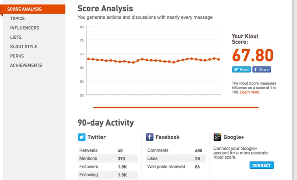 I am a Klout user. I have a high-ish score (68), and receive frequent inquiries based on my number. Here’s the secret: in a lot of ways, that score is completely bogus.