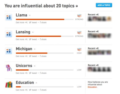 See, Klout is pretty easy to punk. One day, I tweeted about the drama llama. Klout said I was influential in llama. Many friends bestowed +K in llama upon me. It is now, according to Klout, my greatest area of expertise. See also: unicorns.