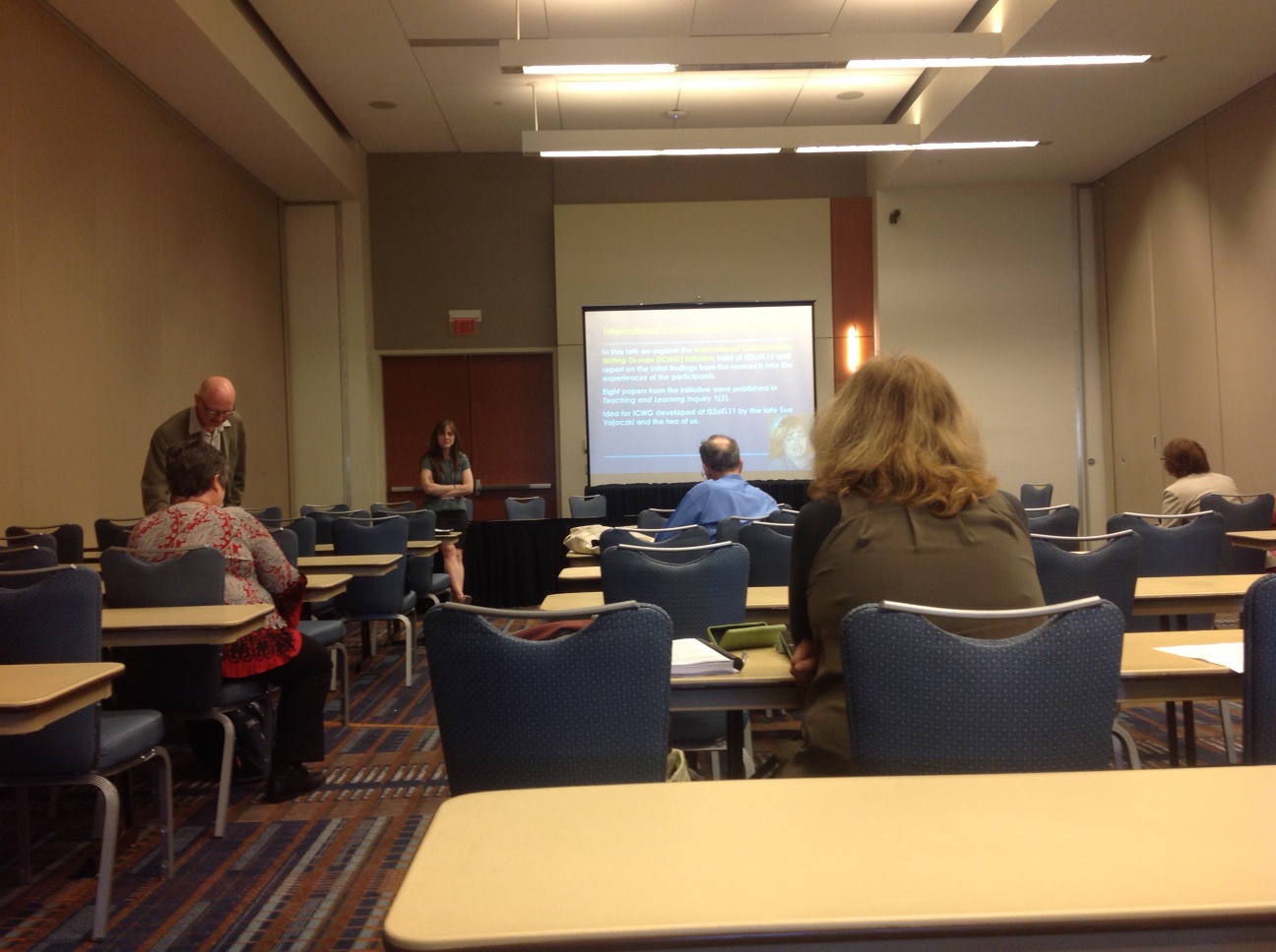 Beth Marquis (McMaster University) and Mick Healey (Higher Education Consultant) reported the results of a fascinating group project and collaborative writing experiment that took place at ISSOTL 2012. Nine groups of diverse scholars from 13 countries worldwide came together to co-author reflective pieces about teaching and learning topics. The groups initially worked at a distance to prepare an outline and then met in person for a two-day writing workshop at the ISSOTL 2012 Conference. Following the workshop, the groups took another three-month revision period before submitting to the ISSOTL journal. The special issue, “Writing Without Borders: 2013 International Writing Collaborative,” was published in September 2013.