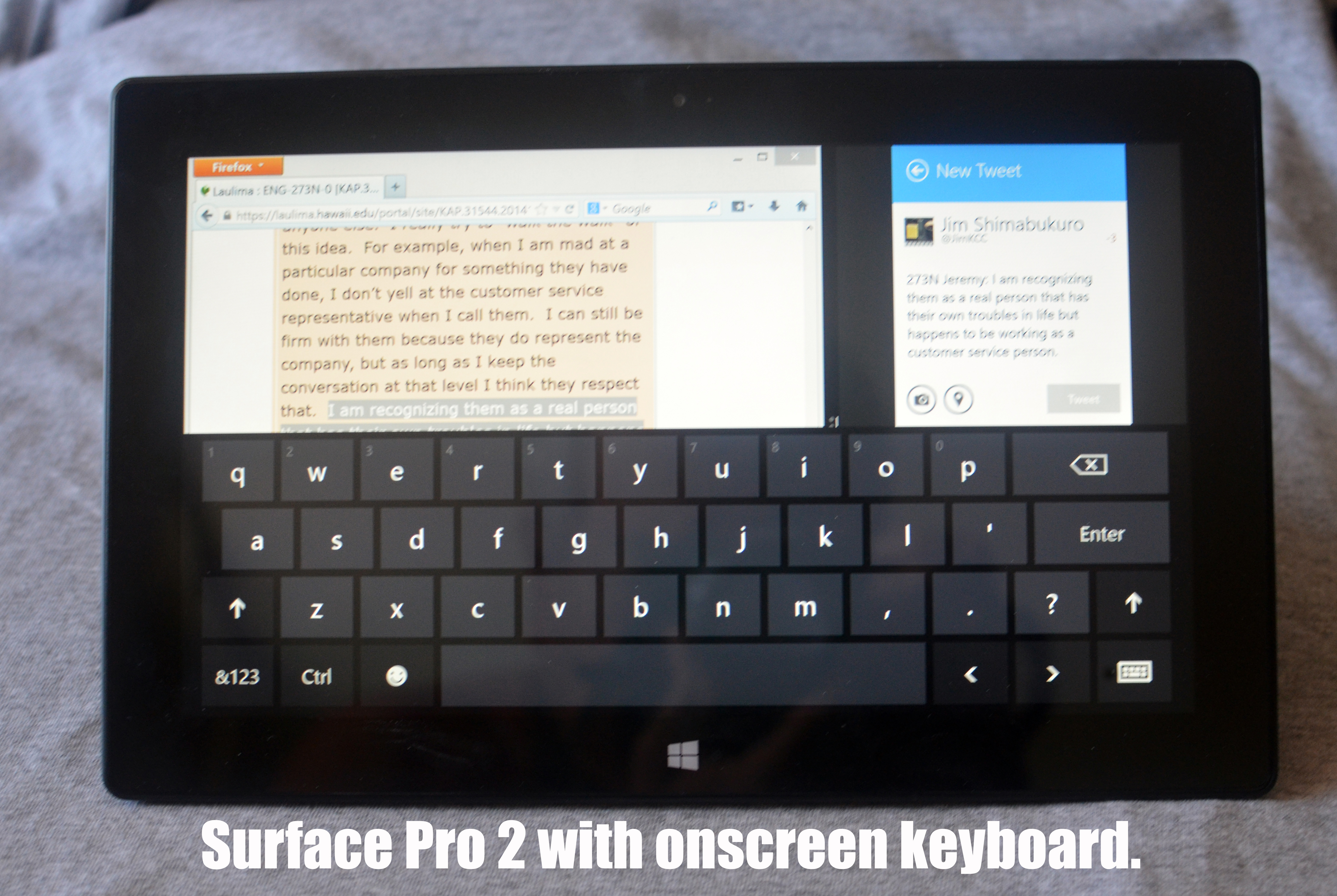 Surface Pro 2 with the on-screen keyboard over the LMS and Twitter.