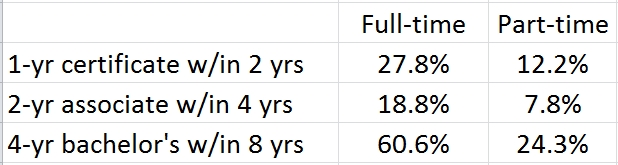 In comparison to full-time students, part-timers fail at over twice the rate in completing certificate and degree programs. Here’s a breakdown from the 2011 survey:
