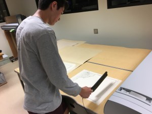 Next, he wipes off the scanner with a microfiber cloth. He then carefully places the map in the scanner, which looks like a giant vacuum sealer, and guides it through with his fingers.