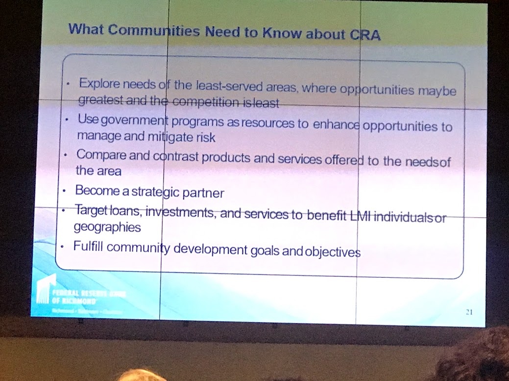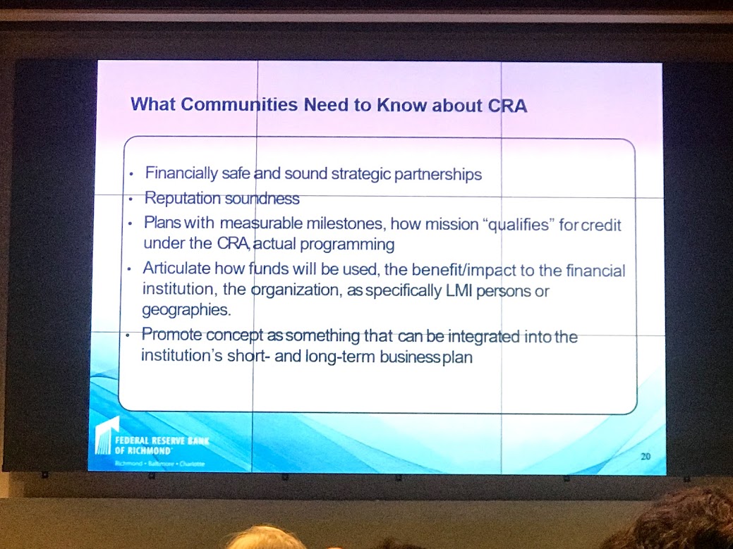 Jeanne Milliken Bonds informed the meeting that the Federal Reserve organizes training sessions for bankers on workforce development. In her view, the banks are genuinely interested in funding innovative CRA projects.