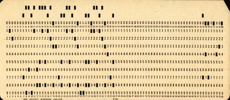 A punched card from the mid-twentieth century. Wikipedia photo and caption by Pete Birkinshaw, 6 Nov. 2010.
