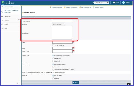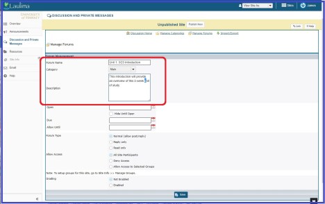 b. On the ADD page, complete the first three items only: FORUM NAME, CATEGORY (select MAIN), and DESCRIPTION. Be sure to click SAVE after you’re done.