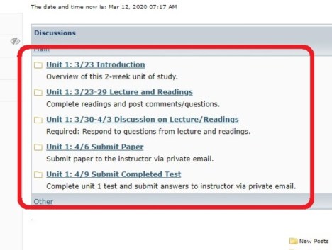 3. Unit 1: 3/30 Discussion of lecture and reading assignments. Instructor-generated questions or topics. Students required to post comments in this discussion forum.