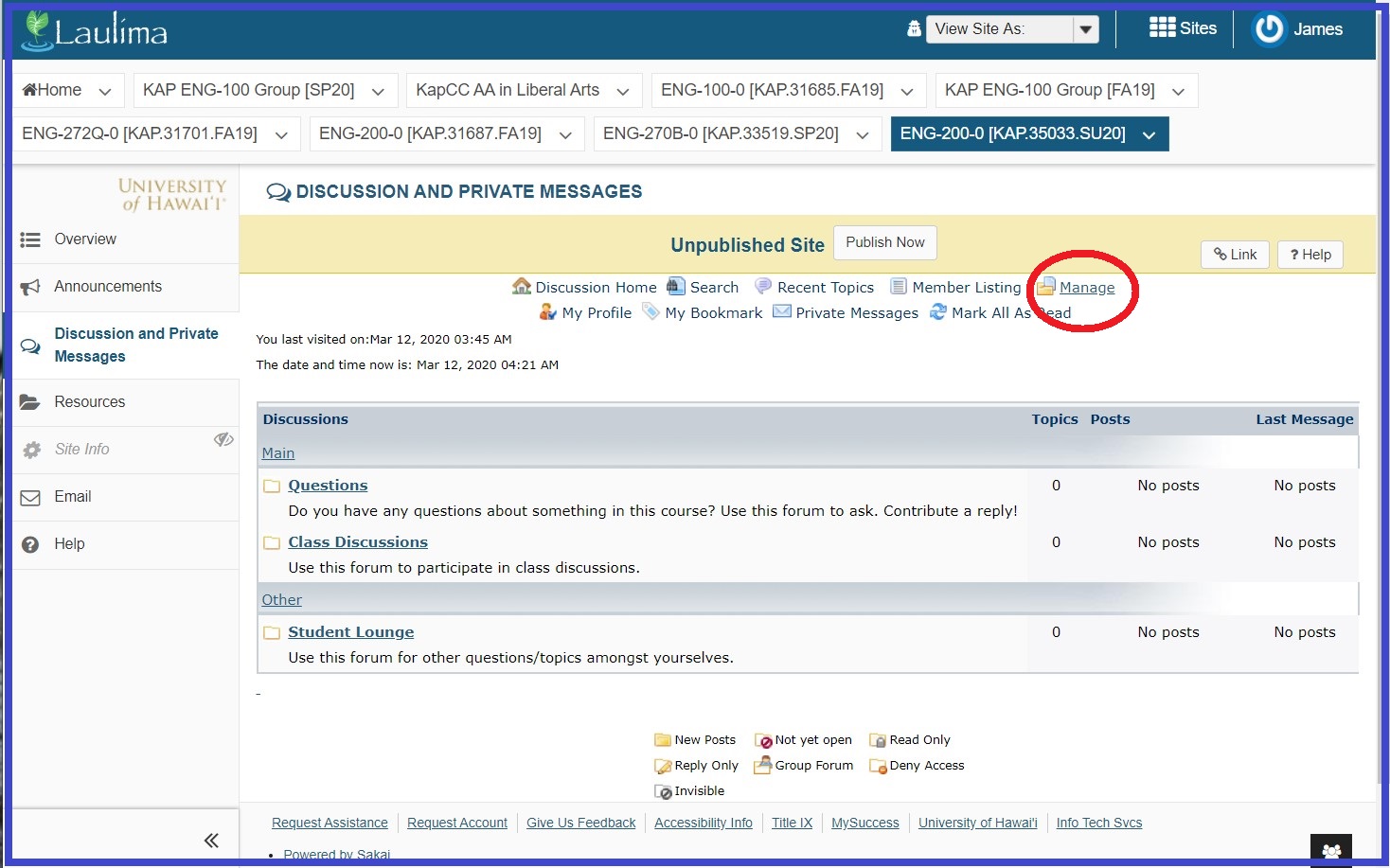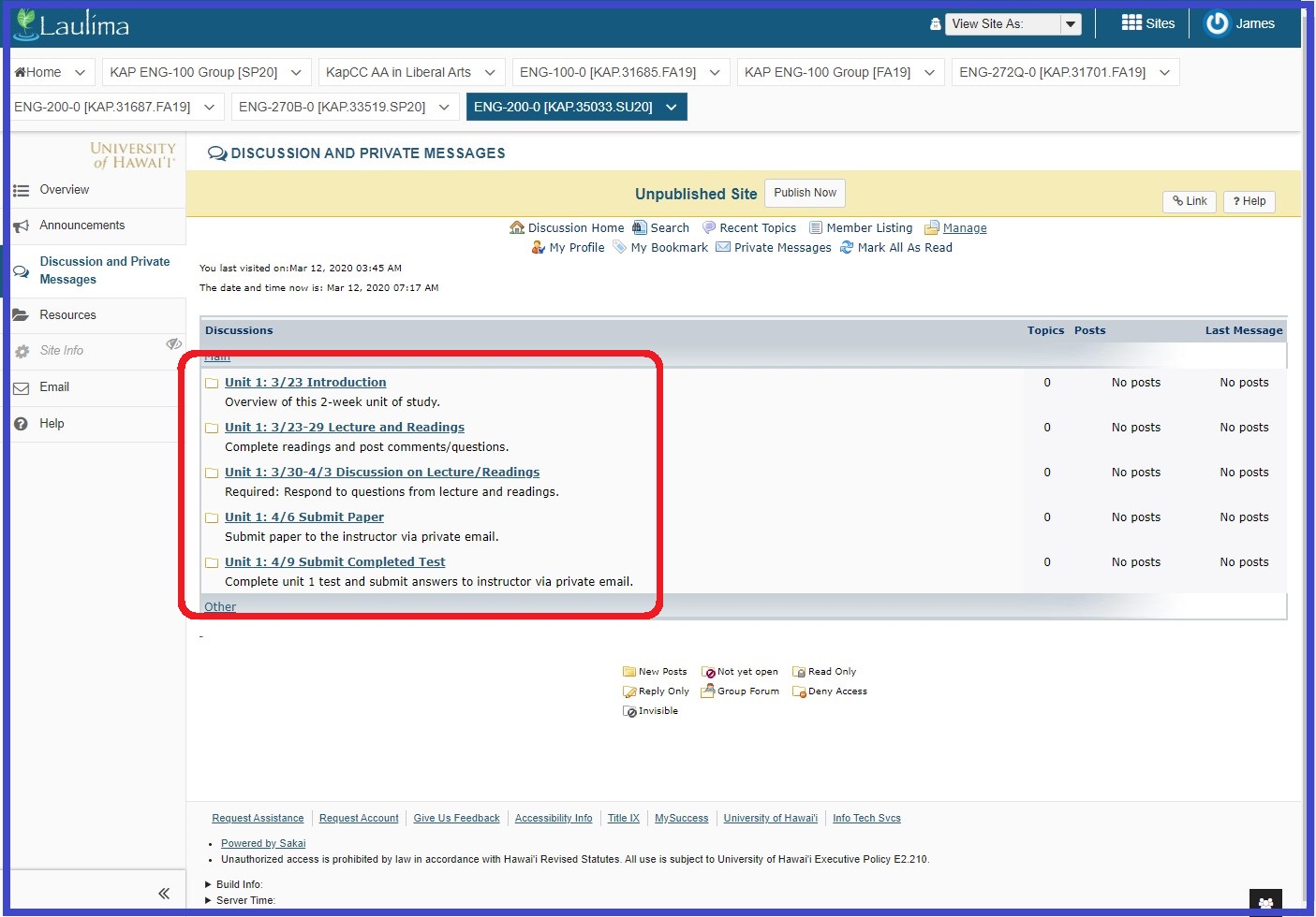 To substantially reduce the learning curve, I’ve devised a quick and dirty method to move a standard lecture-discussion course2 completely online via Laulima’s discussion and email tools. Both are included as default tools in the left sidebar of the basic course structure. There are many other tools to streamline and enhance instruction, but in this emergency and in the interest of time, the focus is on getting up and running with minimal fuss.