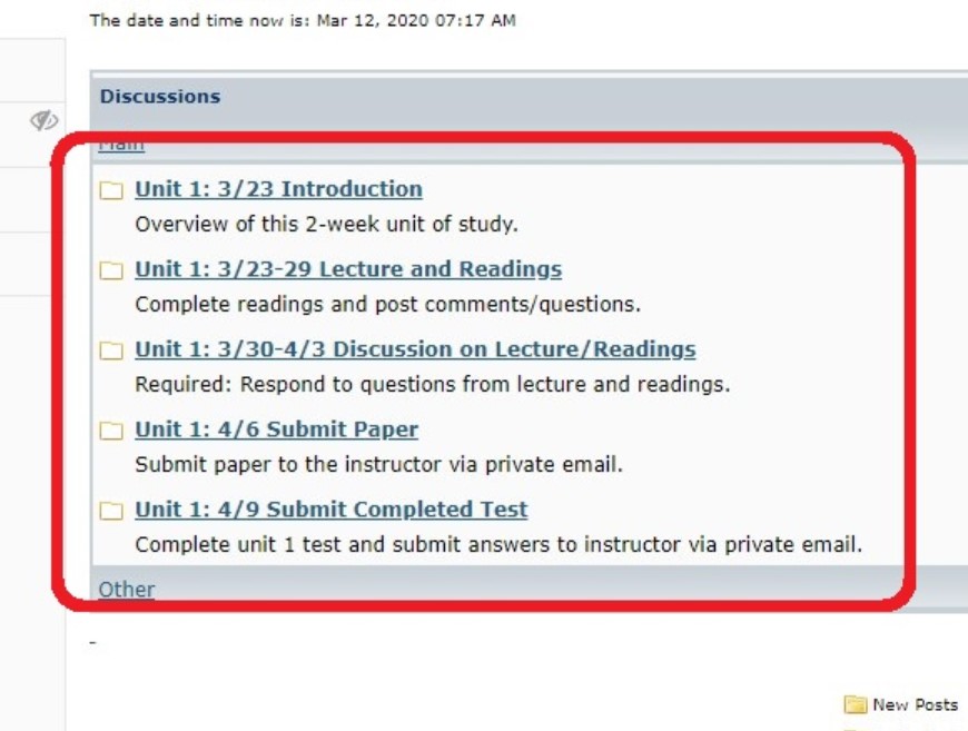 The “Discussion and Private Messages” tool will serve, at once, as a schedule of learning activities, a medium for sharing text-lectures and readings, and a platform for interactive discussions and activities. It’s actually quite intuitive, so the learning curve shouldn’t be too steep. The instructions below are designed to minimize complexity.