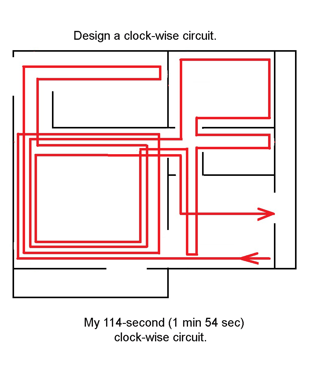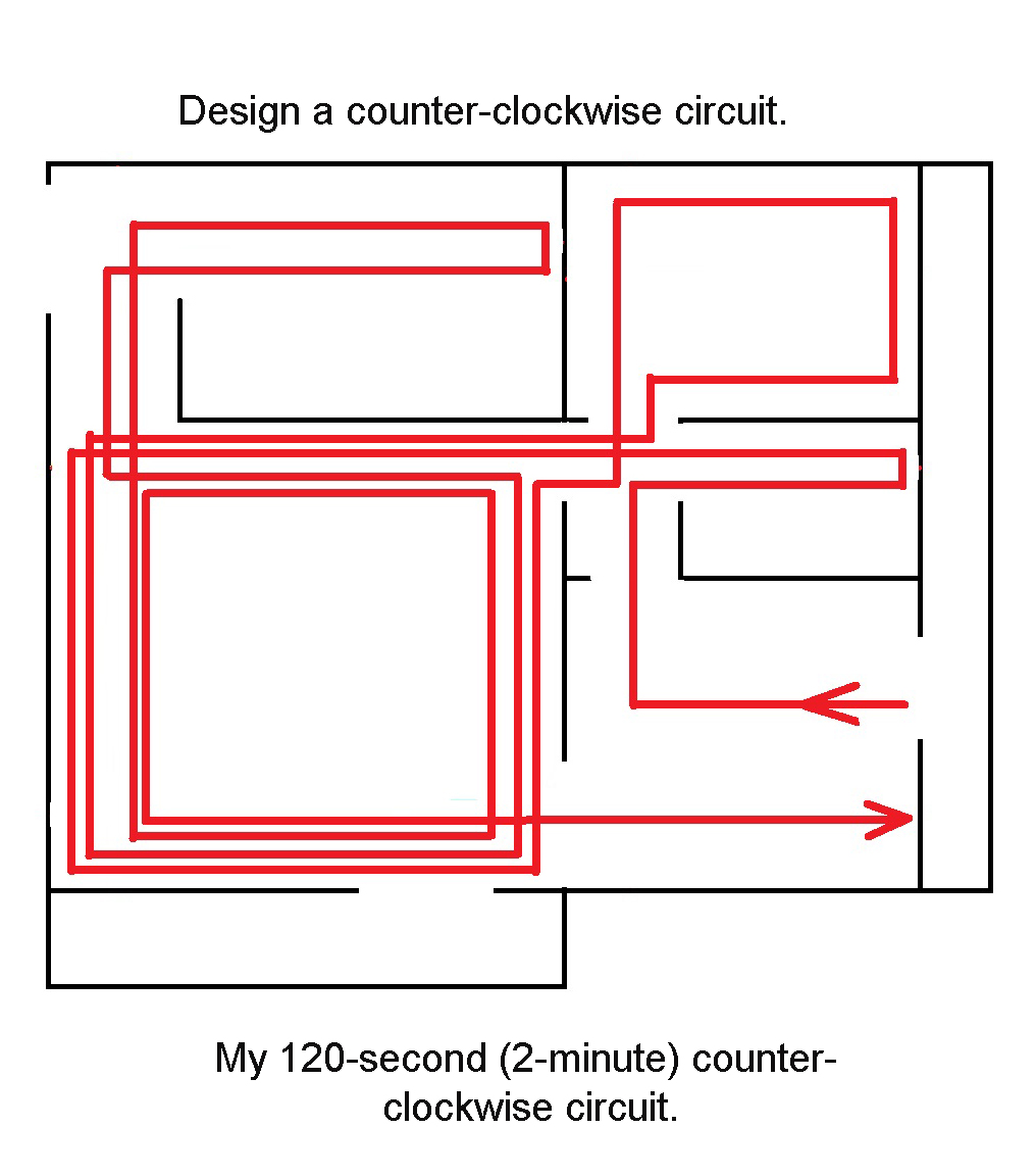 Second, design a counter-clockwise circuit. The layout of your home as well as types and number of paths will determine the design. Through trial and error, settle on a circuit that’s both easy to remember and lengthy. Illustrated below is a route that takes me about two minutes to complete.