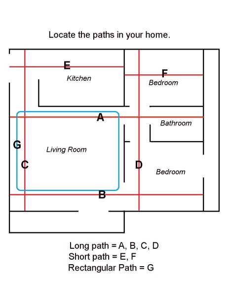 First, draw or create a mental image of a rough layout of the interior of your home. I live in an apartment, so I’ll use it as an example. For my apartment, there are four long straight-line paths, two short ones (red in the illustration below), and one rectangular path (blue). You may need to rearrange furniture to create these paths.
