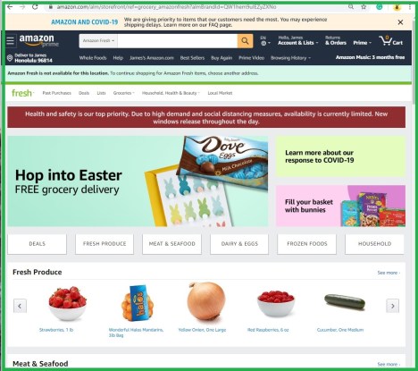 Apr 12, 2020 at 4:54 PM: I did it again. It’s easy to score deliveries on Amazon Fresh. You just have to be sitting at your computer ready to go at midnight. Keep refreshing your screen until you see the time slots available. Ignore messages about stuff being removed from your cart. If you try to fix that, all of the slots may vanish before you’re done. You must have filled your cart earlier in the day with whatever you could find, realizing that many things are just unavailable and that you must await another time or find another source. It is becoming slowly easier to buy your necessities.