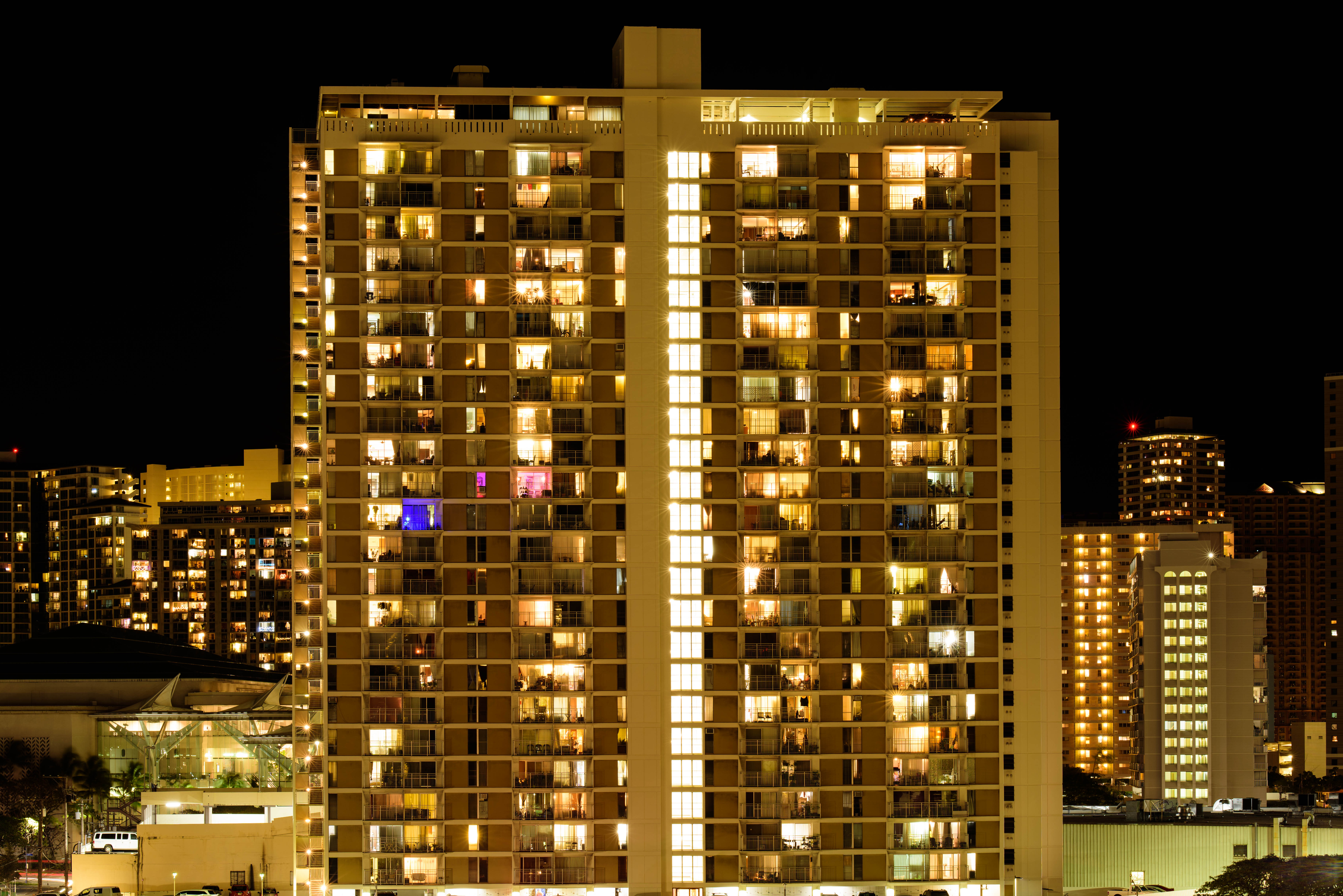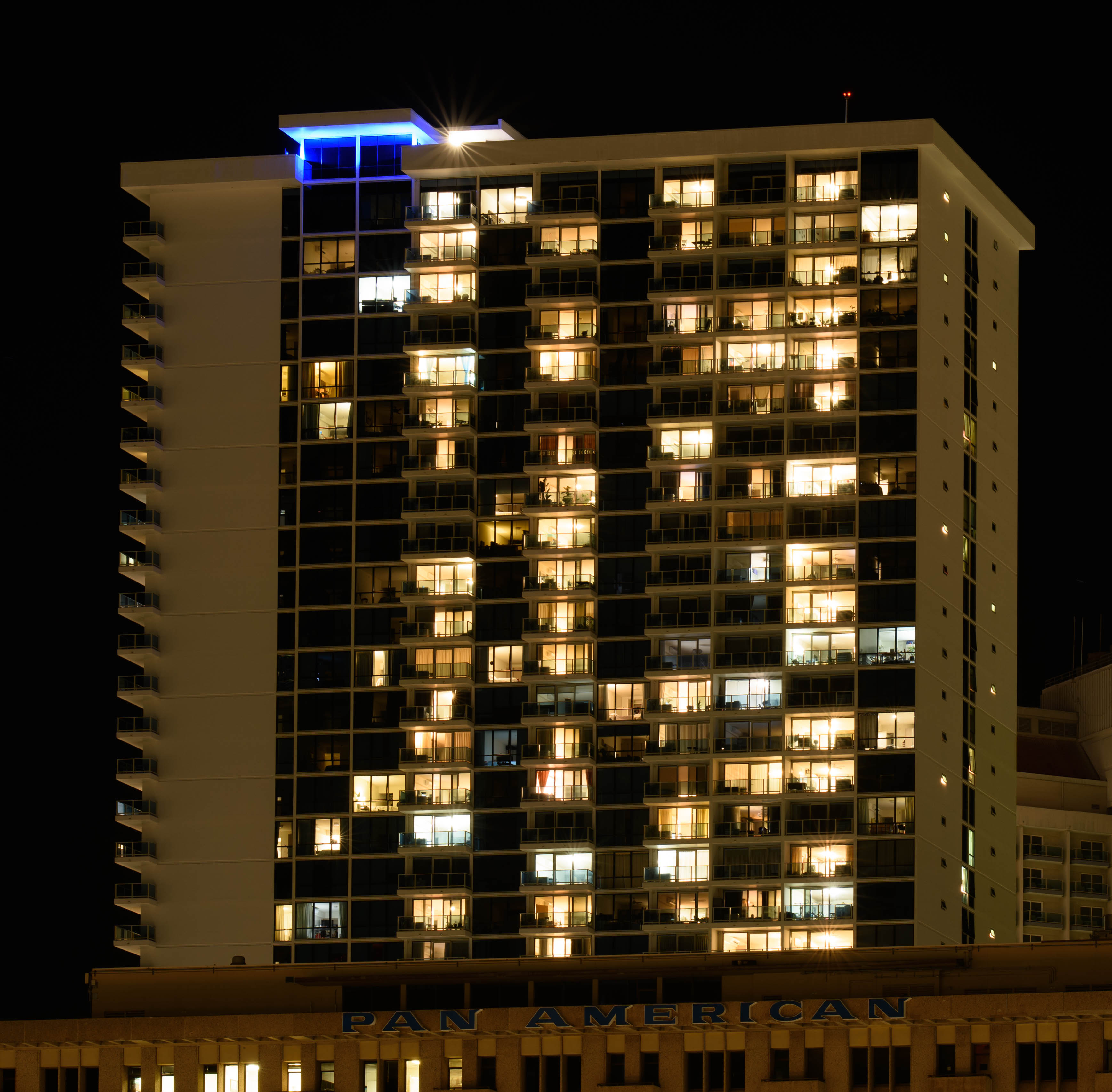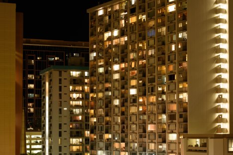 This building is about a block away. The Hawaii Convention Center is visible in the lower left. After a month of sheltering in place, residents cooped up in apartments are restless and anxiously awaiting the end of the stay-at-home order.