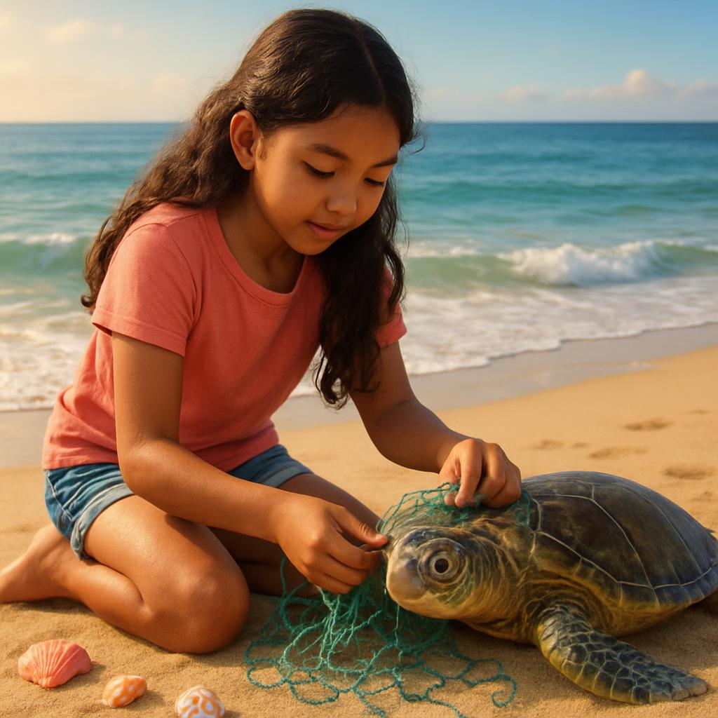 🎨 [Top half of page: AI-generated illustration of a baby honu tangled in fishing line, swimming near bleached coral. Soft ocean-blue background, watercolor style.]