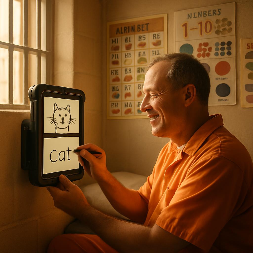 Setting: A large prison where inmates can request either private booth sessions for sensitive topics or use rugged tablets for daily lessons in their cells. The system syncs progress so learning is continuous.