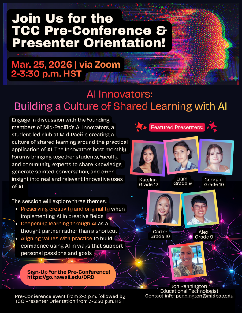 Join the founding members of Mid Pacific’s AI Innovators for a student-led sharing of preserving creativity when implementing AI, deepening learning through AI, and aligning values with practice.- When: March 25, 2026 | 2 – 3:30 p.m. HST (view your local time)