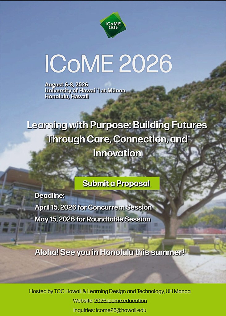 We are excited to announce that TCC Hawaii and LTEC will be co-hosting ICoME 2026 (International Conference on Media in Education 2026) August 6-8 right here on the UH Mānoa Campus. ICoME 2026 serves as a premier platform for international collaboration, knowledge exchange, and innovation in the design and use of media for learning. The theme for 2026 is “Learning with Purpose: Building Futures Through Care, Connection, and Innovation.” We invite you to share your expertise and innovations by submitting a presentation proposal. Please find the full conference details and submission guidelines below.