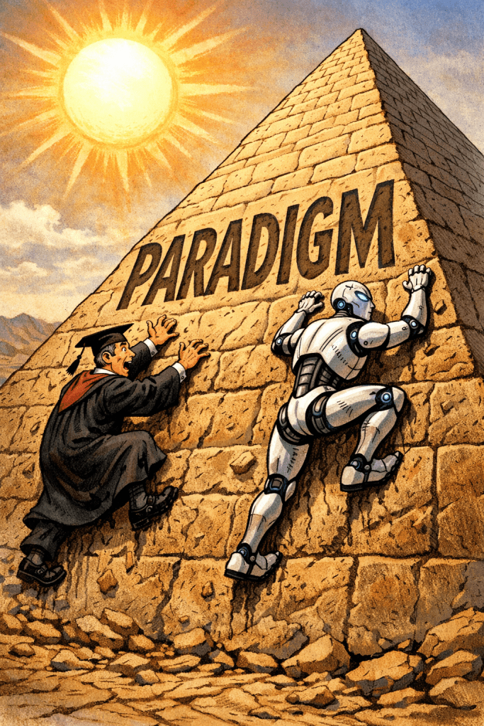 Kuhn argued that paradigm shifts do not occur when a field improves its tools or refines its practices. They occur when anomalies accumulate to such a degree that the foundational assumptions of normal science can no longer contain them, producing an epistemological crisis from which an entirely new framework must emerge.² The AI anomaly in higher education is precisely that kind of accumulating crisis, because it simultaneously undermines three pillars that have sustained the university for centuries: information transmission through lectures, standardized assessment as proof of mastery, and the university’s monopoly on credentialing.³
