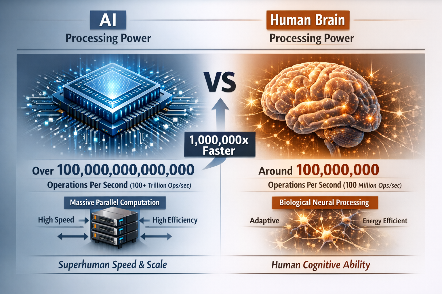 Taken together, the most accurate conclusion is that AI’s greatest power advantage is not any single capability—such as rapid data processing—but the compound effect of speed, scale, consistency, and integration operating simultaneously. This creates a qualitatively new form of intelligence: one that is not broadly human-like, but is extraordinarily powerful within structured, data-rich domains. The frontier, as current 2025–2026 research suggests, is not a simple competition between human and machine intelligence, but the emergence of hybrid systems in which AI handles computation, pattern detection, and scale, while humans provide context, judgment, and meaning.2,5,6